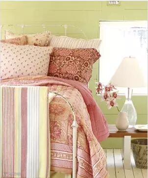 女生卧室装修效果图:粉色的床毯在绿色的小卧室空间中显得出彩很多,如置身花鸟世界中,自然恬静,温暖舒适。