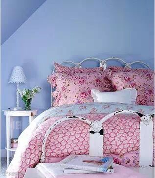 女生卧室装修效果图:田园式的床头设计,搭配花朵图案的田园风床品,精致的小台灯,地中海蓝的背景墙,一切都是那么的自然、纯真。
