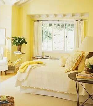 女生卧室装修效果图:明黄色的墙面令人心情大好,素色淡雅的床品、灯饰又让人心情平静。