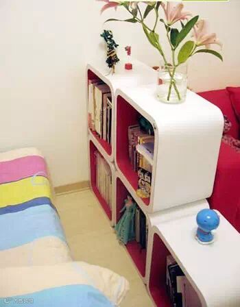 女生卧室装修效果图:前后通透的个性储物架不但可以起到隔断的作用,还是收纳的好帮手。