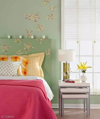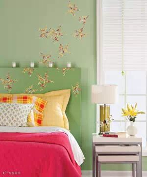 女生卧室装修效果图:不规则的图案拼贴,像蝴蝶一样翩翩飞。绿色的墙面与白色的台灯罩给这个空间带来一份淡淡的自然青草味。