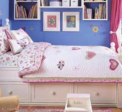 女生卧室装修效果图:另一种选择是向内,靠紧两面墙壁,墙面上可以增加小型的储物架或者隔板,摆放琐碎的小东西。
