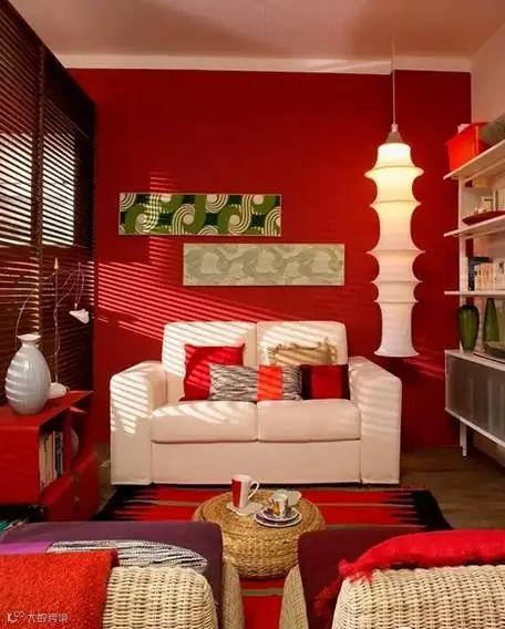 ◆整面墙都选用红色具有较强的视觉冲击力,在冬日里能温暖心底最深的角落。白色沙发及配饰降低了空间色彩饱和度,提升视觉舒适感。