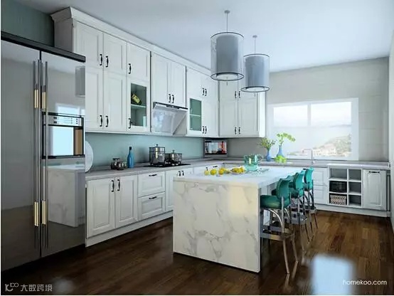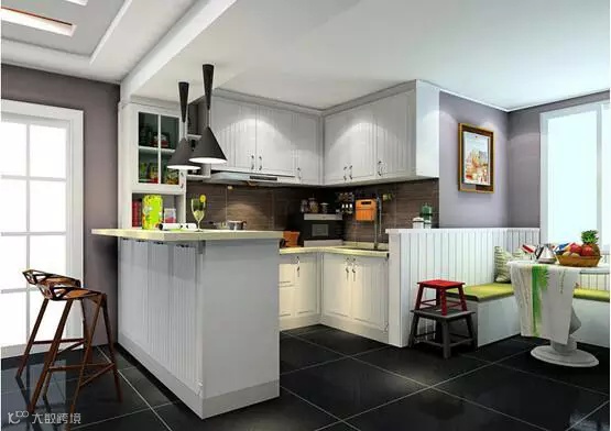 推荐理由:在客厅与厨房的分界处设计一长方形的餐桌,配以高脚椅,这样既可当餐桌,也可当待客用的吧台,同时也是两个空间的隔断。