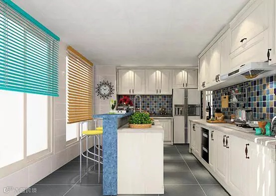 推荐理由:吧台隔断了厨房,使其成为半开放式的空间,同时也扩充了厨房的操作台面积。白色格子瓷砖背景墙的线条若隐若现,充满质感。