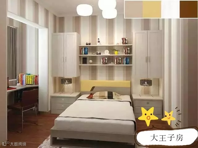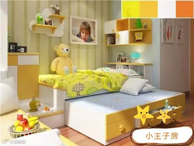 小王子房活泼氛围要归功活泼的色彩搭配,柠檬黄和橙黄体现了男孩子的活泼开朗,白墙和浅棕色地板又恰与黄色协调,营造出干净清爽之感(注:移门衣柜可定制,但板面花纹是效果所需,不能定制)。