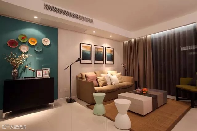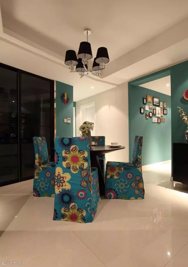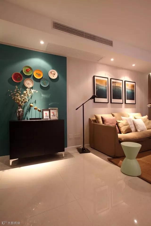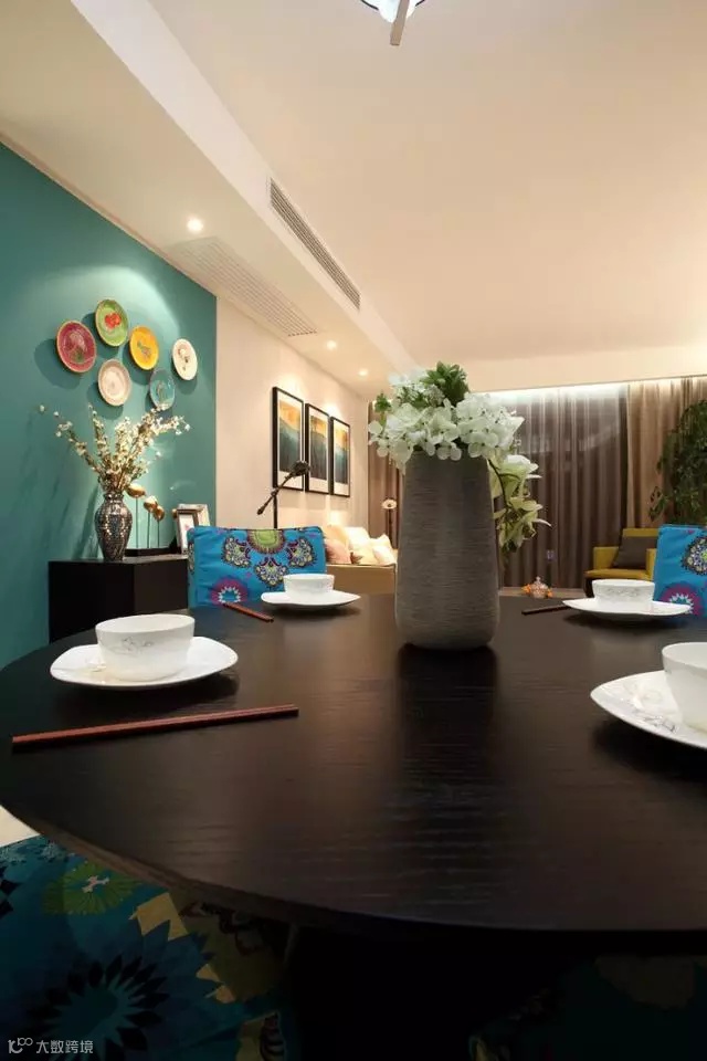 以深绿色为背景墙的设计很好的与白色背景墙相区别开,同时又很好的区分了两个不同的空间,随意挂置的盘状的小画又充满着异域的情调。