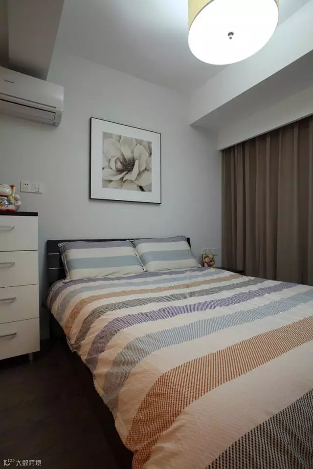 简洁的布艺床上用品显得舒适而休闲,没有华丽的吊顶而只是以白色乳胶漆刷至而成,墙上挂置的一朵白色花样的画作,清晰而富有感觉。