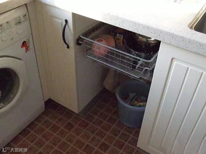 ▼最后是我想很多次的开放式拉蓝的部分,把橱柜空开一段,装上一个开放式的拉蓝放蔬菜水果,下面放垃圾桶兼放摸布,使用又好看。关键是即增加了台面的空间,又省了一组地柜的钱,小厨房的同学可以多多考虑哈~~~