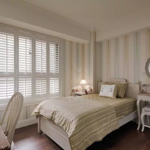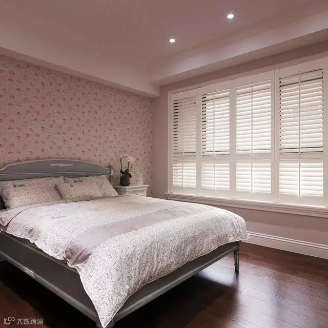 ▲卧室选用粉色碎花的壁纸,白色的百叶窗,给人一种舒服美好的感觉。