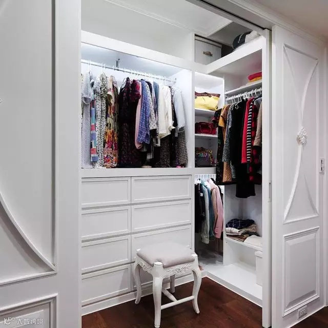 ▲衣帽间选用深色的木地板,白色乳胶漆的欧式家具,这样的衣帽间实用又带有质感,非常美好。
