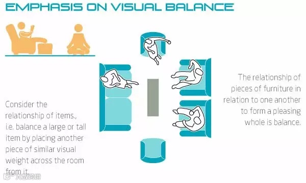 ▲ 需要考虑家具的大小、高低、颜色,对各个物件的视觉重量有大致把握,通过调整家具位置形成一个平衡、对称的视觉关系。