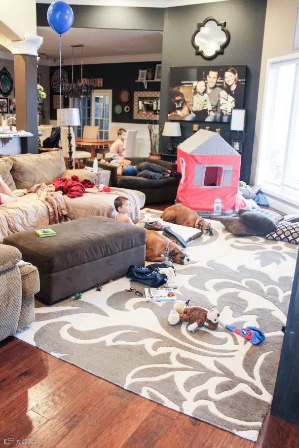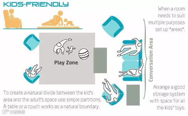 ▲ 用桌子或沙发等家具作为天然边界,将孩子的游戏区域与大人的聊天空间自然区分开。此外,不要忘了设计良好的贮存空间来放置孩子们的玩具哟。