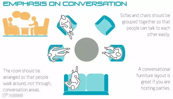 只是通常我们在计划把客厅家具放置在何处的时候,你要想到沙发的主要用途十有八九是为了方便人们坐下来聊天。