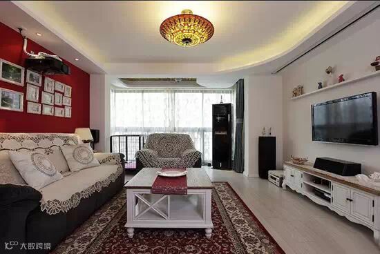 ▲客厅装修全貌,红色的电视背景墙,红色造型的吊灯和地毯,非常的热情而温馨!