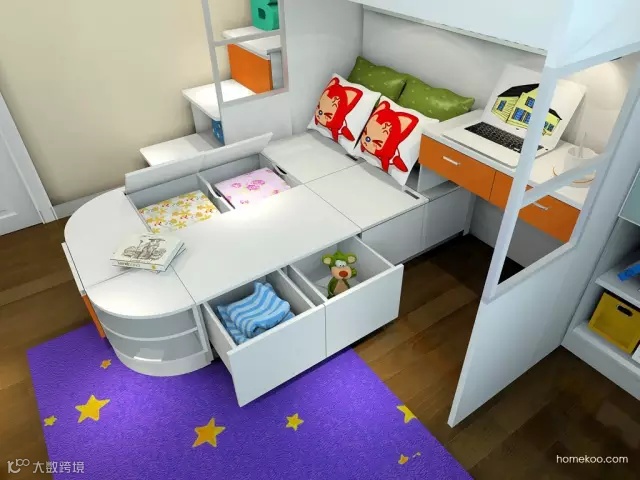 02 此设计可以收纳孩子的不当季衣物、被褥、玩具等,拓宽孩子在房间的活动范围。