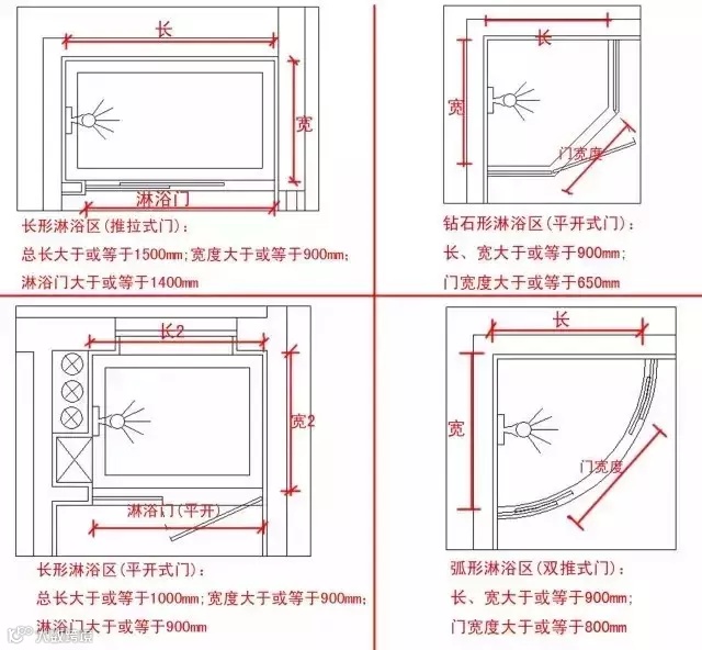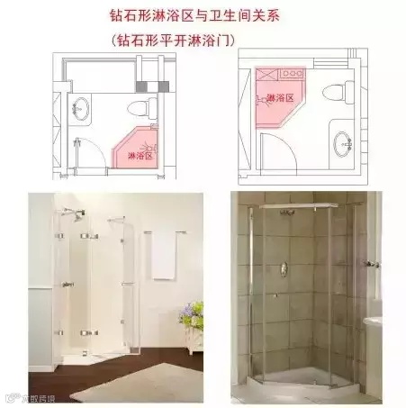 淋浴区规划与卫生间的布局有着很大关系,以淋浴门之隔以内为淋浴区,也叫淋浴房,因此确定好淋浴区的规划也直接决定了选择什么款式的淋浴门,所以淋浴区与淋浴门通常分为:直形、钻石形、弧形。