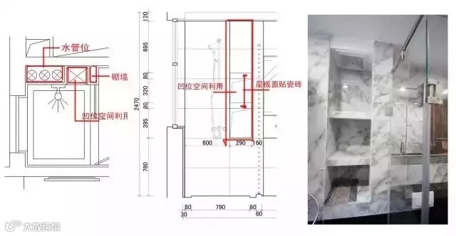 空间的利用主要是能满足一个放置淋浴日用品的区域,特别是在一些淋浴区有管道的空间。