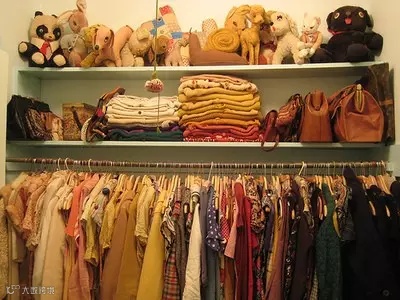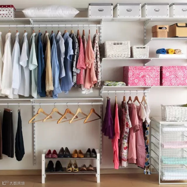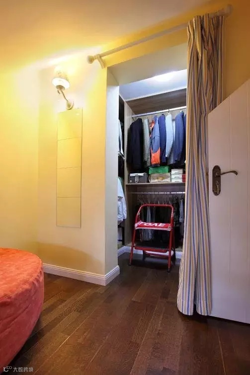 小户型就要利用垂直空间来做衣帽间,可以在壁橱里安装杆子,然后墙壁上面做隔板,这样下面可以挂衣服,上面可以放宝宝和其他切起来的衣服。