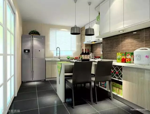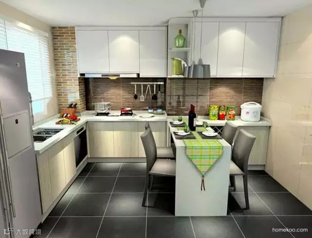 把餐厅收到厨房里,利用墙面的凹位把空间分为L型的烹饪区和L型的用餐区。