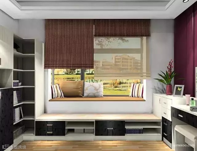 房间的飘窗较高,设计师特意在窗前设置了一列高矮组合柜,让飘窗有了楼梯的感觉。