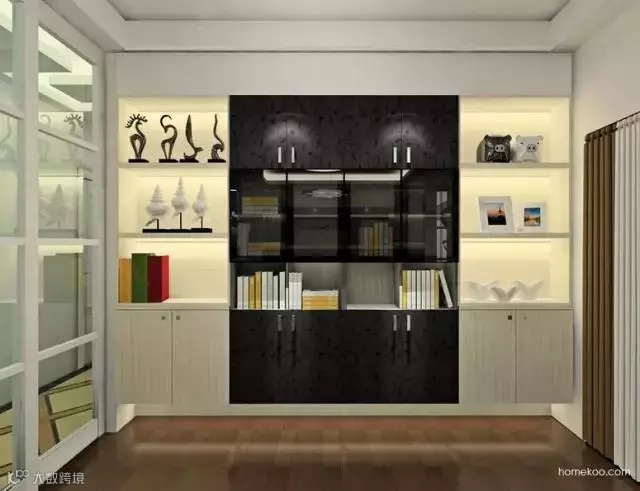 书桌与书柜采用双向一字型摆位,充分利用这个书房的宽度。使得书房的功能性更强。