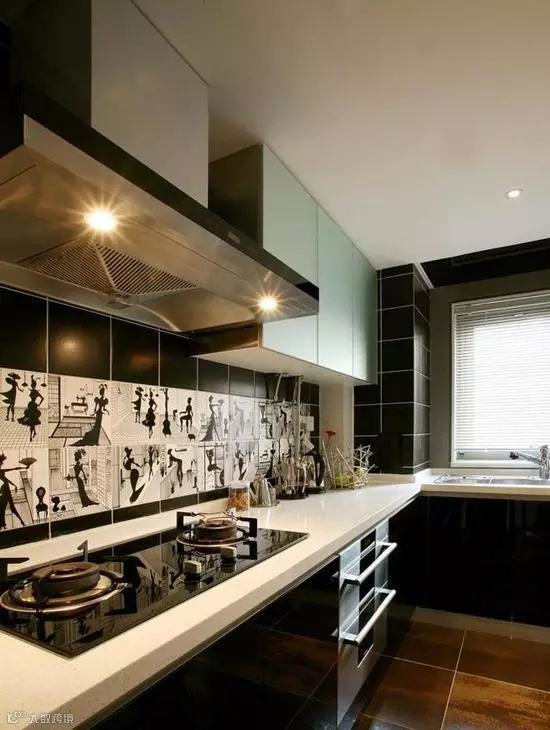 ▲墙壁上黑白摩登图瓷砖比较有个性,感觉能够驾驭这间厨房的妹子一定是酷酷哒~开放式厨房,抽油烟机的选择乃是重中之重!