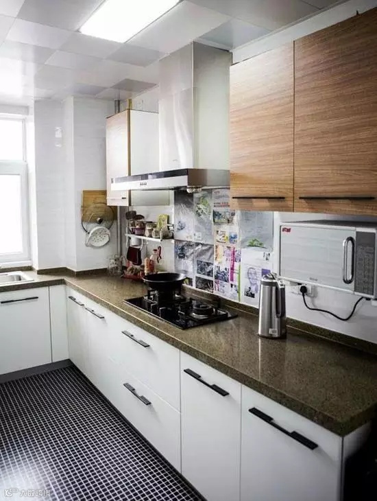 ▲一款很居家的厨房,你一定也看到炉灶对面墙壁上的旧报纸了吧。拆卸方便,也不会让整个厨房看起来油腻腻的。