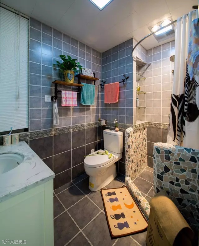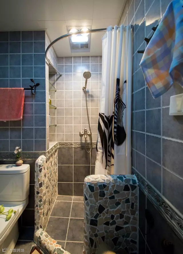 ▲ 蓝色卫生间,淋浴房是自砌的,用浴帘