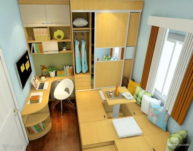 衣柜内侧巧妙融进去一个书柜,转角区域自然而然打造成学习区。一个紧凑的直角空间就解决了两个大难题。