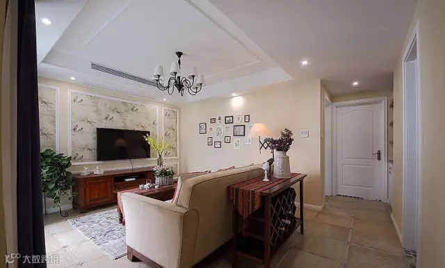 ▲ 电视墙用线条做了三个框,分别用花鸟壁纸填充了