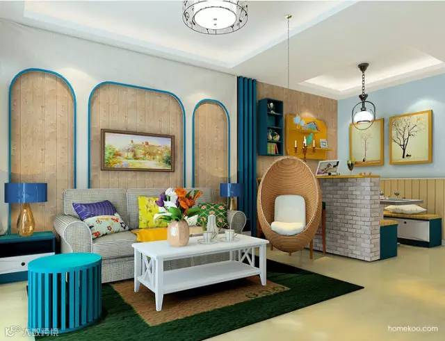 小小文化砖吧台作为隔断,区分开客餐厅区域,连同吊椅还自成一方独特的客厅休闲区。