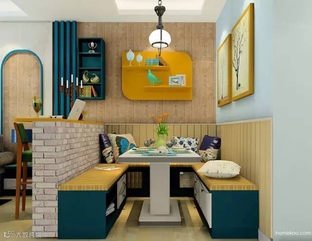 餐厅布局尤其巧妙,卡座设计3面可坐,内里可收纳杂物。省下了餐边柜同时还开辟了收纳空间,一举两得。