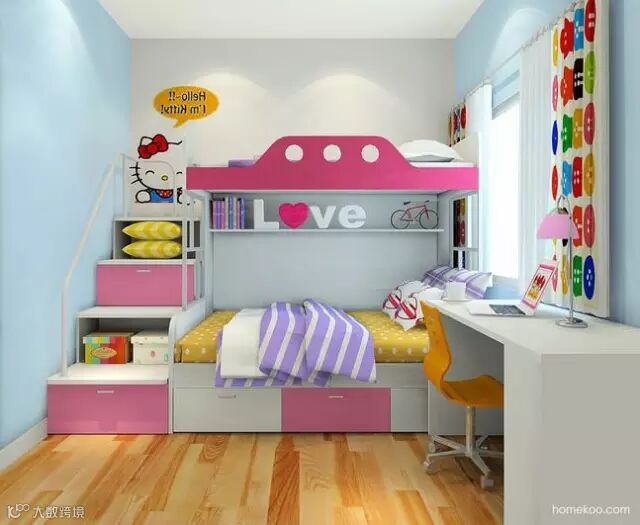 孩子杂物多,因此将下床设计成抽屉床。同时,整个楼梯的阶梯就像4个小收纳箱拼搭而成,实用又可爱。