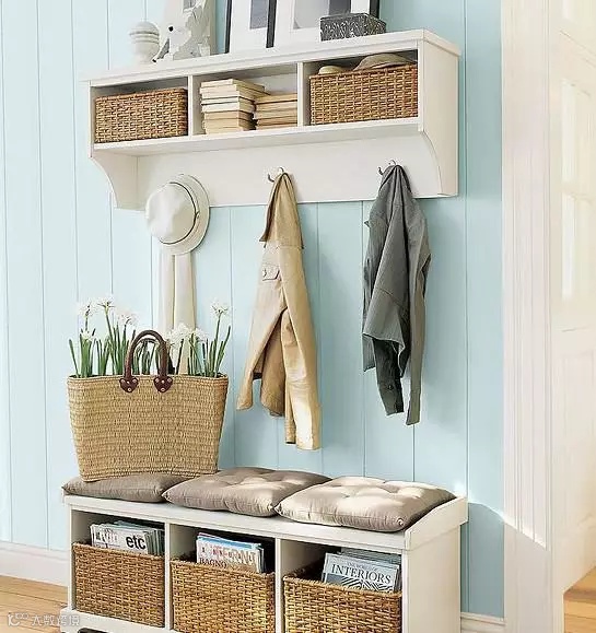 很多人喜欢在玄关放置藤制篮子,实用又美观;要挂的衣服很多?那就设计一个阶梯感的挂衣空间,简单又大气!