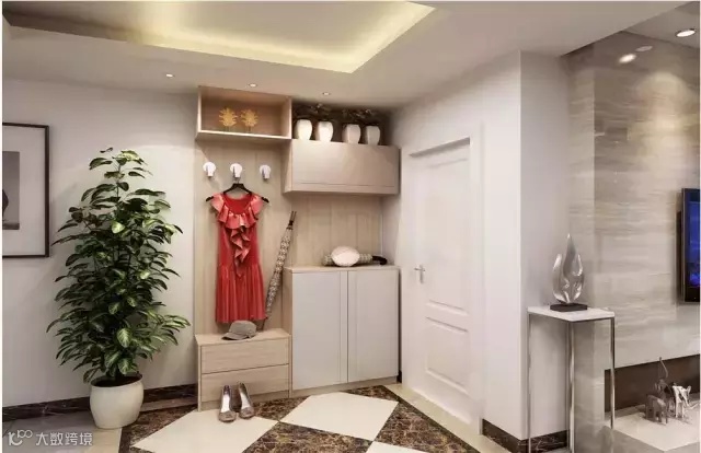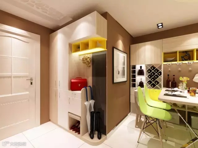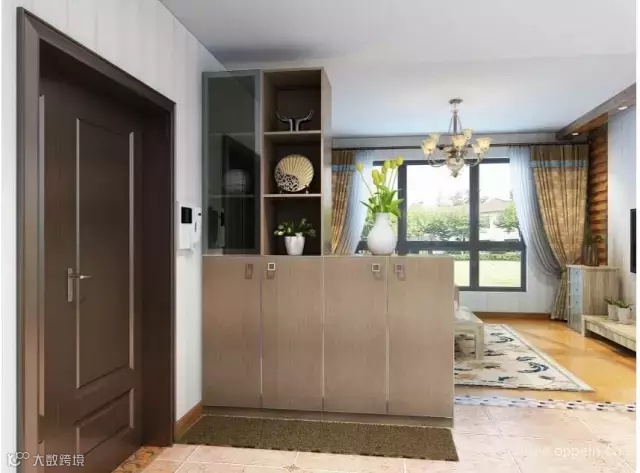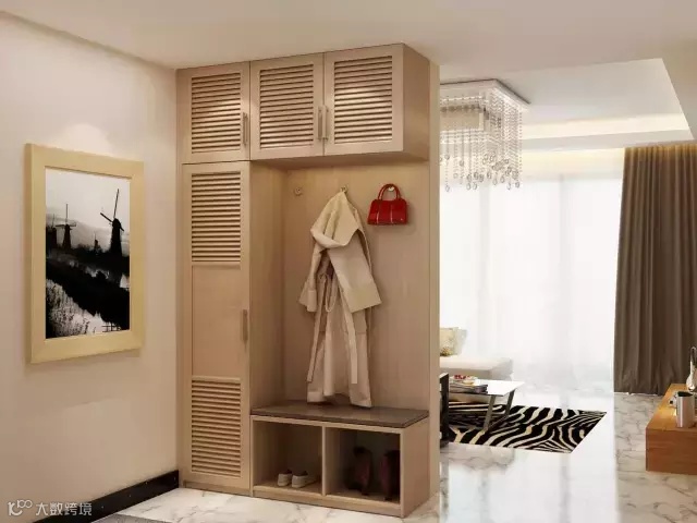 玄关通常与客厅或餐厅相连,可通过放置到顶的玄关柜进行装饰性功能分区,让玄关与厅的关系连而不直达、隔而不断。