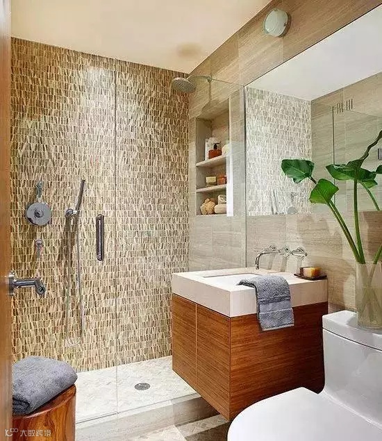 整旗鼓后的卫浴间以"大自然"为主题,主打大地色和绿色。