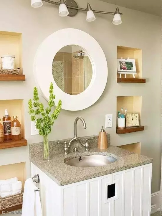 墙面设计真是神来之笔,圆形的镜面与两侧6个方形的墙面凹槽相映成趣,收纳空间顿时翻倍。镜面下方还安排了四个插座,应该可以满足你的需要了吧?