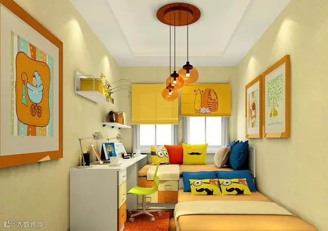 以中间为主线,打造对称的双子椅与榻榻米床相连,这样的设计新颖又可爱,增加了儿童的趣味,同时也给了小朋友睡眠时间的安全空间。