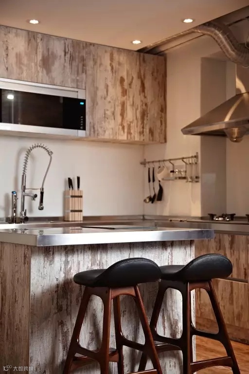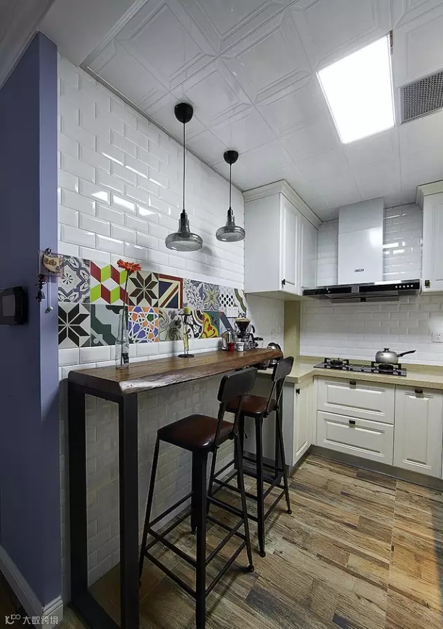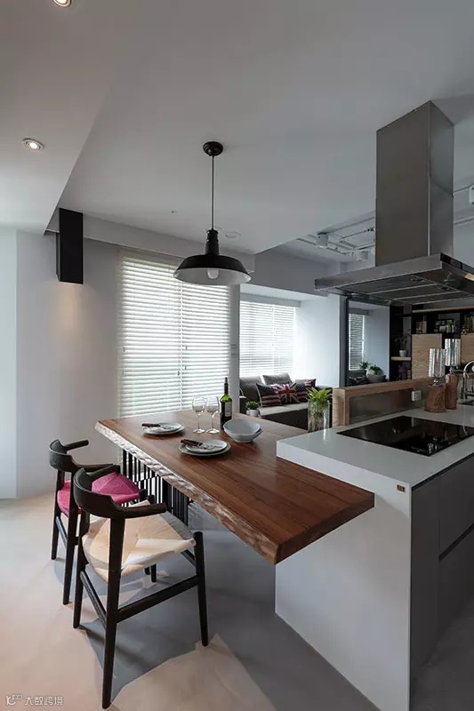 ▲顺着厨房的墙壁打造一个小吧台,量身定制,再根据空间大小放两个高脚凳,厨房和餐厅合体了!