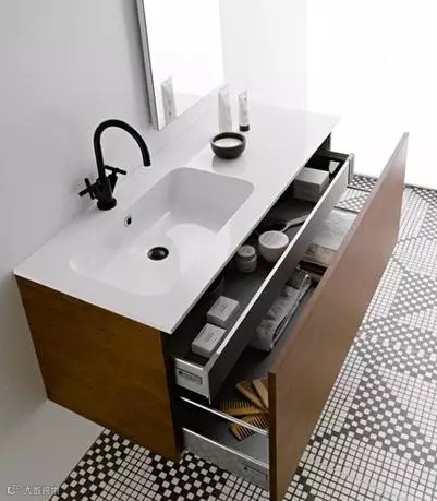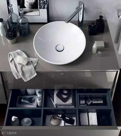 拥有多层抽屉的洗手池绝对是小浴室的必备法宝,合理地利用起洗手池下面的空间才是真正的收纳赢家。如果抽屉里面还能分出功能隔断来那便是最方便的。
