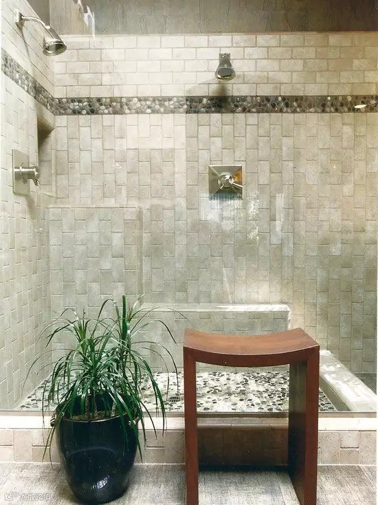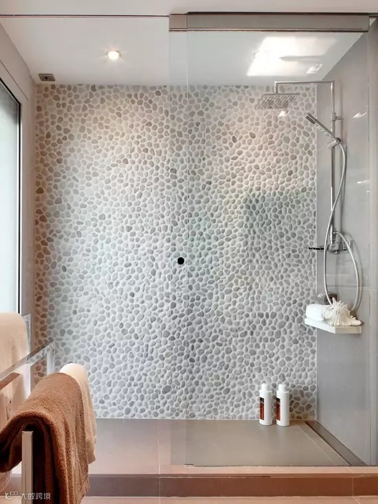 ▲鹅卵石绝不仅仅可以应用在地面上,创意的把它搬到墙面上,淋浴时水汽氤氲,给人溪水潺潺的安然娴静错觉享受,让人回归自然。