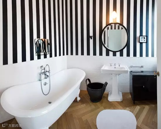 ▲黑白的条纹在纯白的浴室里,有了高冷的风骨。而底部为了防潮则使用瓷砖铺砌出纯白的基底。夏日里清爽整洁也是视觉上的舒适。