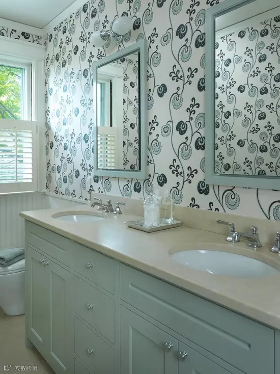 ▲与家具色系风格统一的背景墙纸也是给卫浴添彩简单又实用的方法,墙面蔓延的枝桠花朵,优雅的绽放。