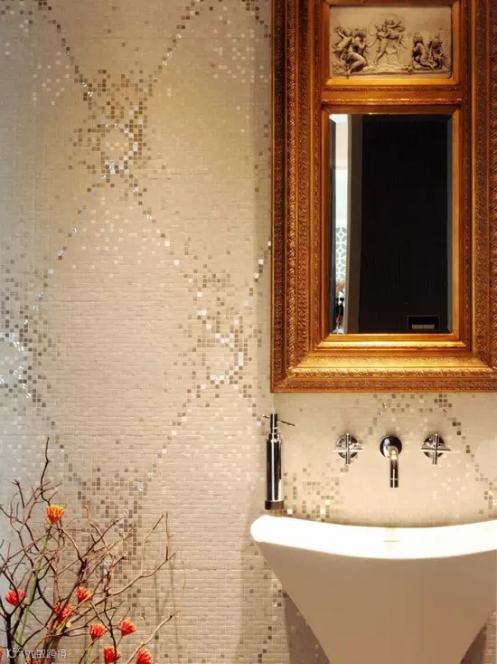 ▲马赛克装修总能突出个性,这间卫浴中,白色的马赛克拼砌成背景墙的同时以亮片马赛克组合成菱形图案,粼粼闪闪。