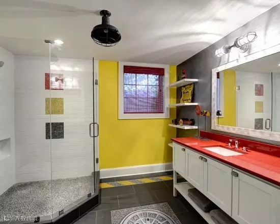 ▲跳脱的红、黄以及黑色组成了这件卫浴的墙面,颜色的亮丽容易给人热情和活力,还有一颗童稚的心,何不敞开心怀接受家装的斑斓色彩。