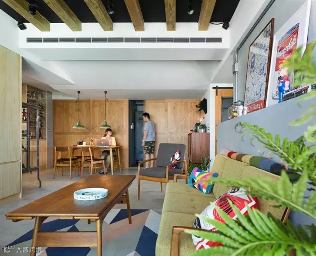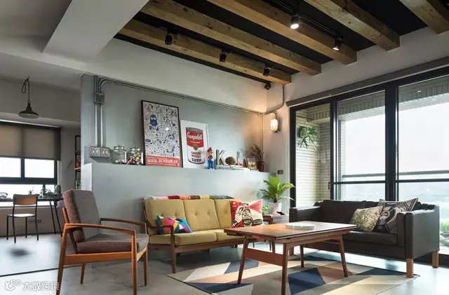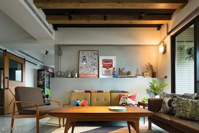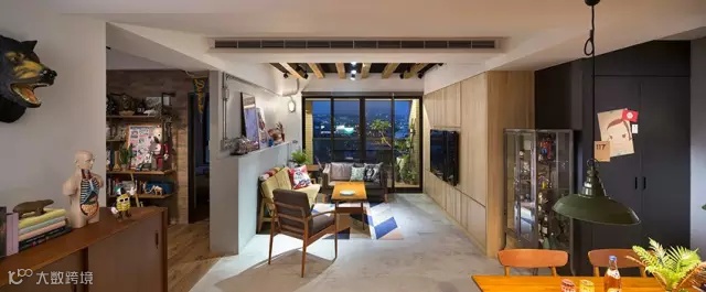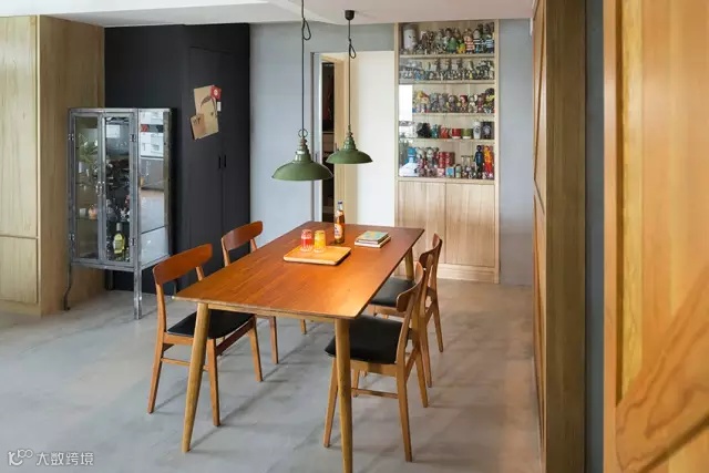 ▲ 水泥粉光的墙面和地面加上裸露的线管,虽然是工业风,但是配上实木以及丰富多元的收藏品和装饰,让整个空间充满了暖意