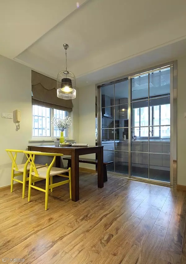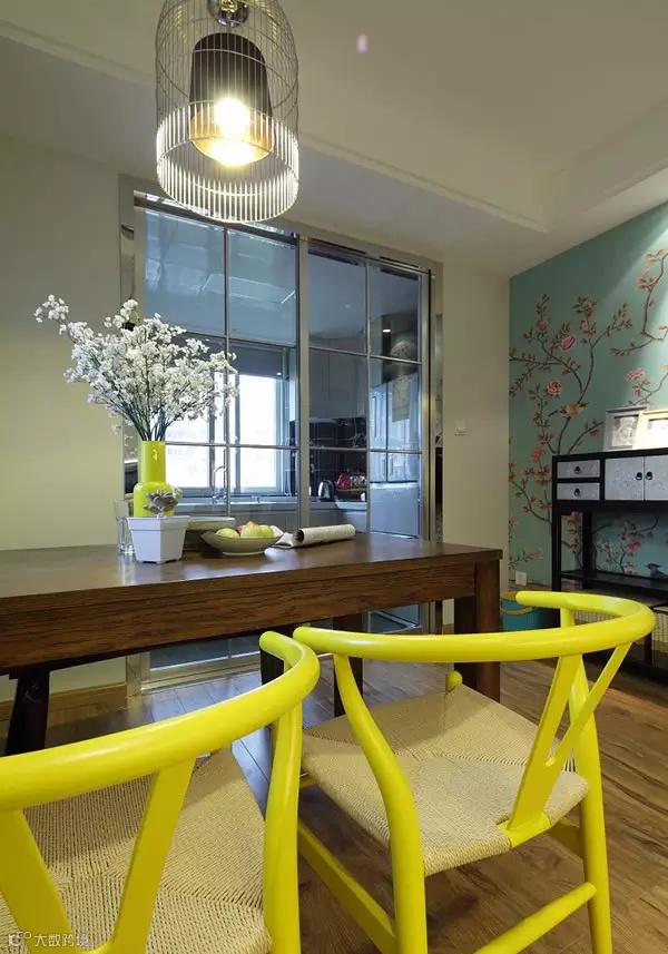▲ 入户进门处是餐厅,两把柠檬黄的椅子『照亮』了整个空间