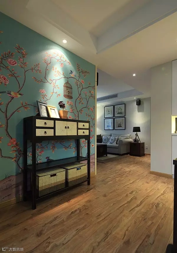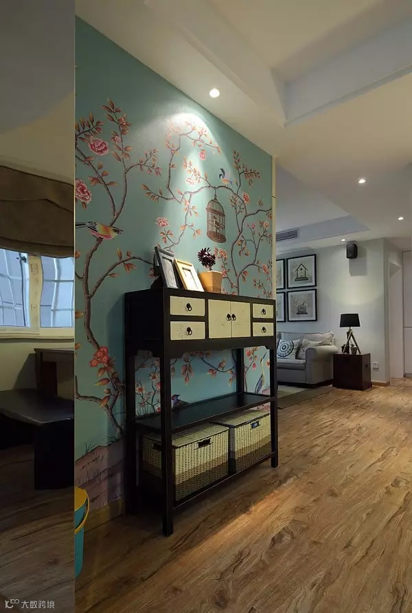 ▲ 这面餐厅背景墙用花鸟壁纸铺贴,柜子美丽且实用