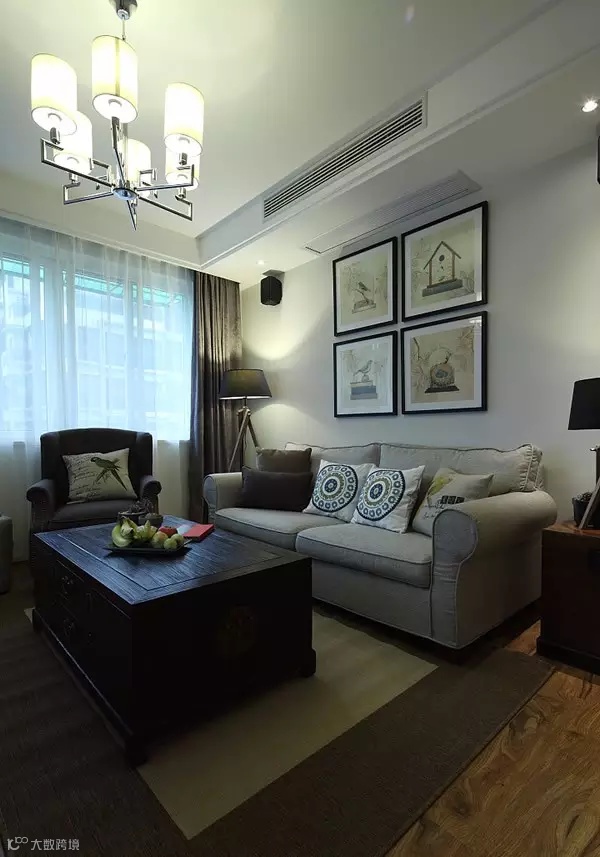 ▲ 浅灰色布艺沙发和中国风元素实木茶几